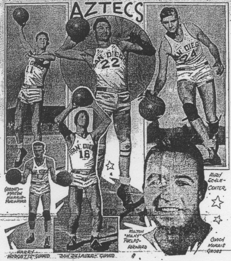 The need for tougher competition timed right into Coach Gross’ loading up not only the schedule, but with his most talented teams. Led by sophomores Milton “Milky” Phelps, Dick Mitchell and Harry Hodgetts of Hoover High, San Diego High star Bill Patterson and Los Angeles junior college transfers Andy Echle, and Earl Allison, the Aztecs won the Championship during their last SCIAC season. Phelps and Junior Don DeLauer, the number one and two scorers in the league were named All-Conference for the 25-7 squad.